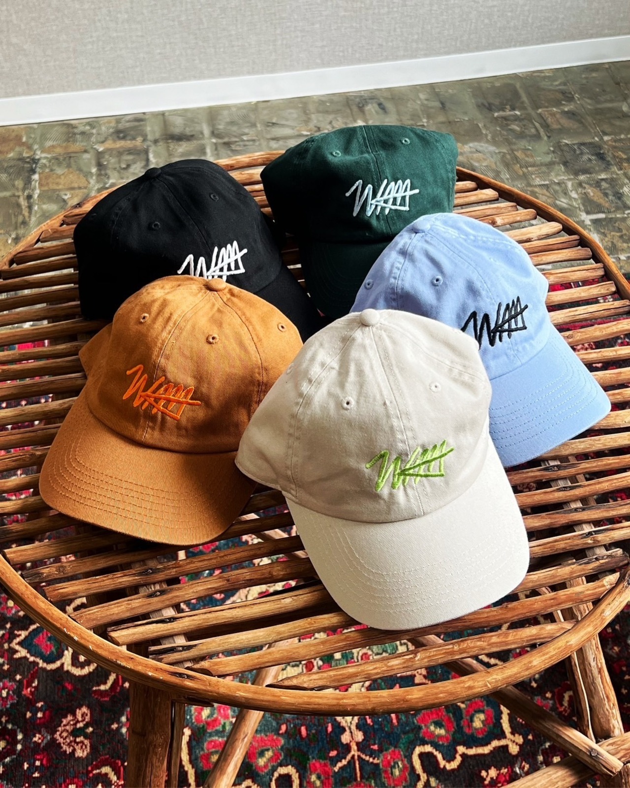 オリジナルのスクリプトロゴを刺繍したベーシックスタイルのキャップ。