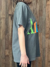 某有名テクノロジー企業の販促用Tシャツからのオマージュ。STUDIOWEAREALLANIMALSファーストコレクションからの定番アイテムです。プリントはラバープリントのクラック加工。ボールバイオウォッシュ加工によりUSEDの様な柔らかい肌触りを再現。襟、裾、袖口にはライトなダメージ加工が施されている。