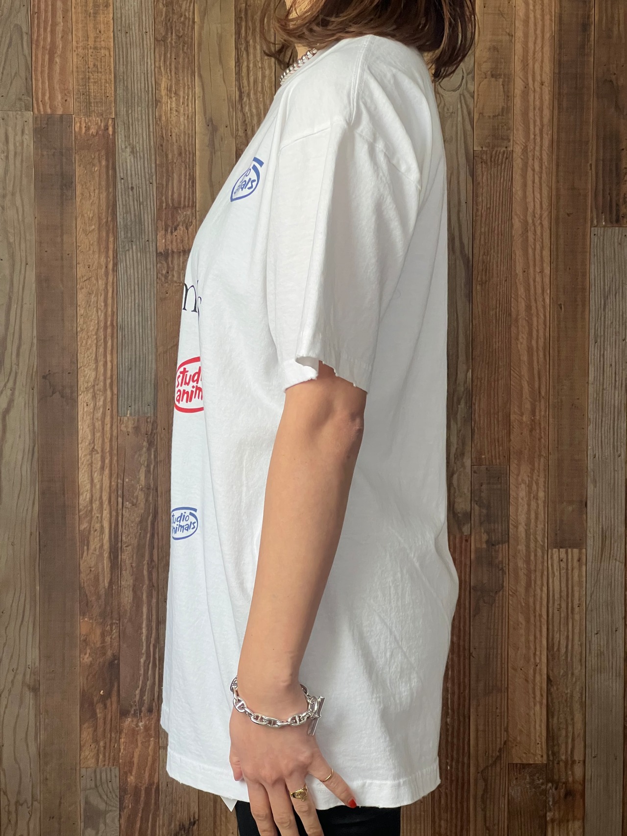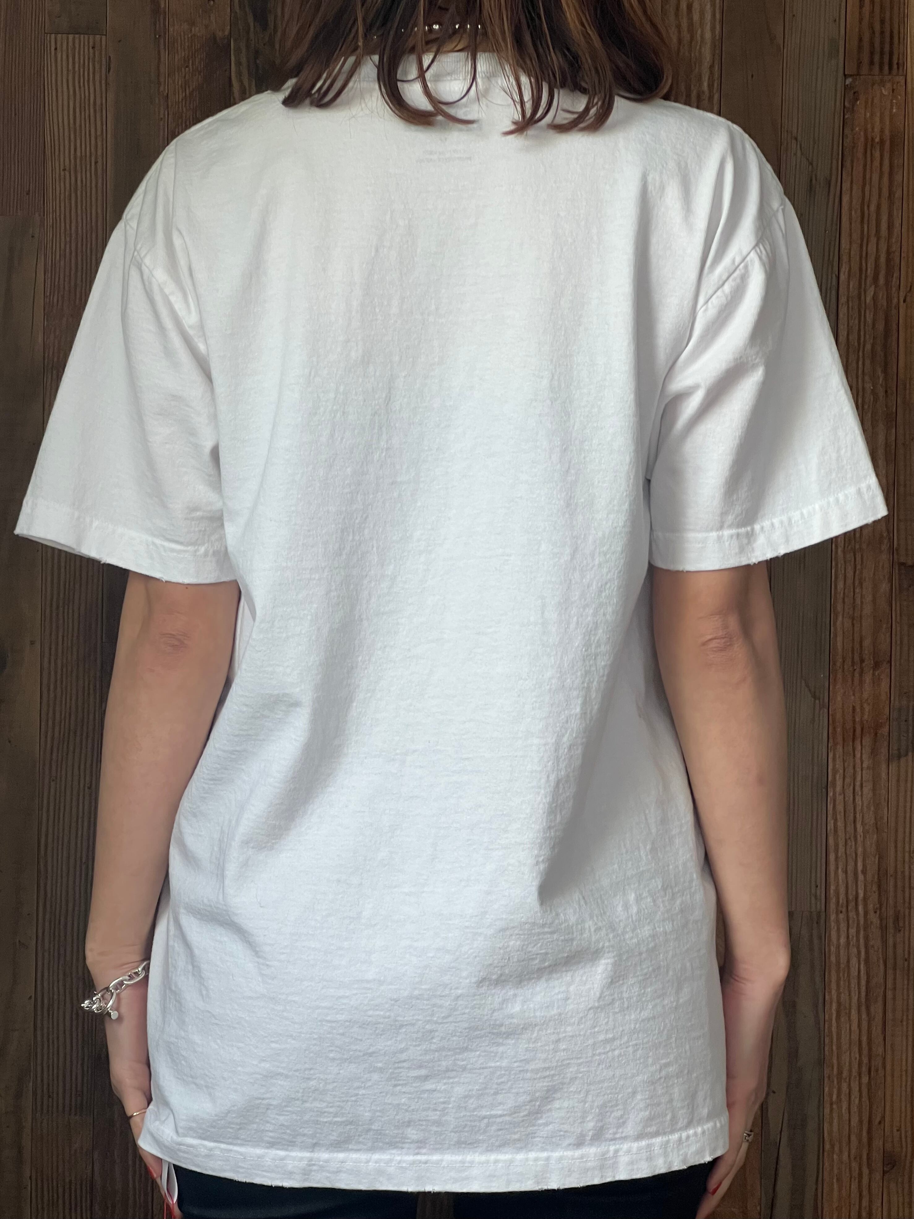 米国テクノロジー企業の90年代販促用Tシャツのオマージュ。プリントは染み込みプリント。ボールバイオウォッシュ加工によりUSEDの様な柔らかい肌触りを再現。襟、裾、袖口にライトなダメージ加工が施されている。